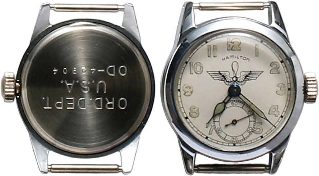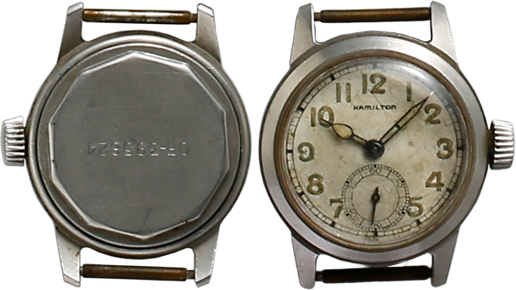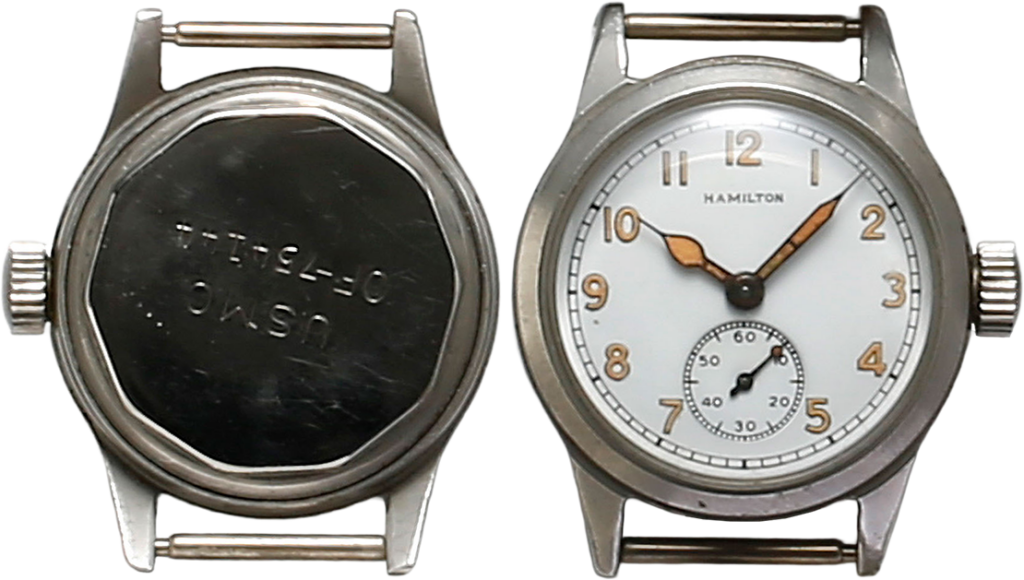 ハミルトン、アメリカ陸軍一般用、最も多く生産された腕時計のひとつだ。バックには防水ケース、15~17石のムーブメントを使用していることを表すOFの刻印。