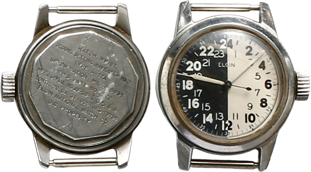 エルジンのタイプA-17。文字盤が白と黒に塗り分けられ視認性向上の効果を高めている。ウオッチリスト、セコンドセッティング、ナビゲーションハックの刻印がある。