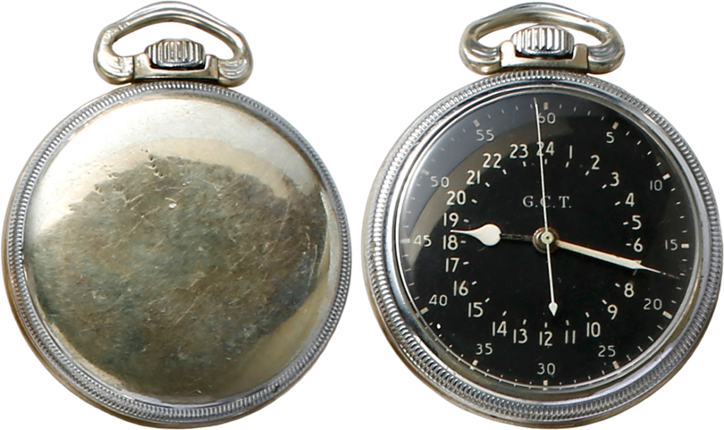 第2次大戦中に陸軍の陸軍航空隊の航空機用に開発されたナビゲーション・ウオッチ。ハミルトン製のAN5740ナビゲーション・ウオッチ。Aは陸軍、Nは海軍、共同開発の時計だ。G.C.Tはグリニッジ標準時の意。裏ぶたに刻印が見られない。
