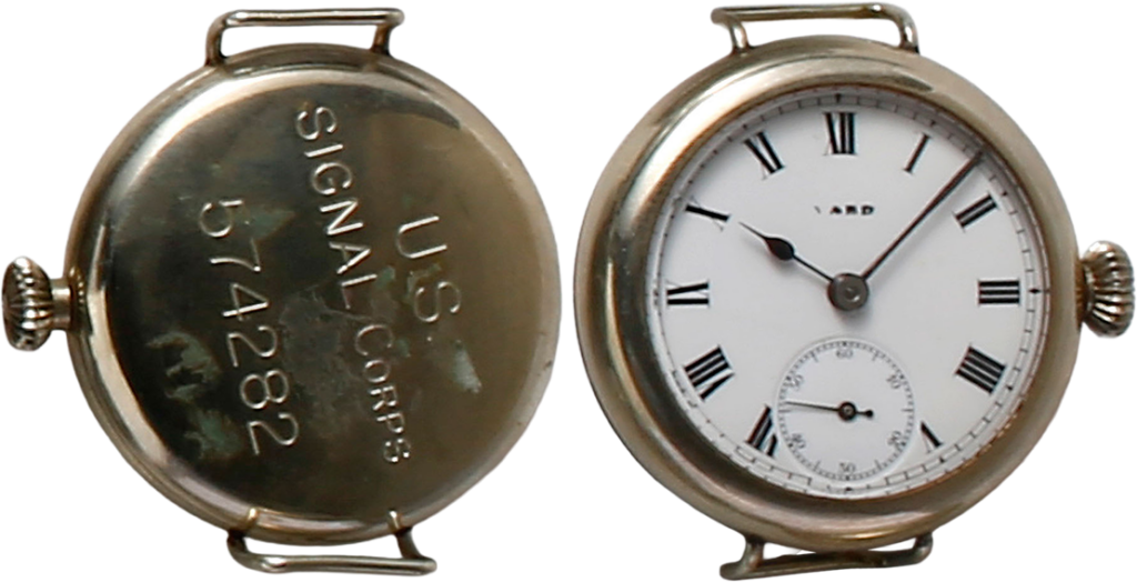 ポケットウオッチの両サイドにラグを付け、リストウオッチとして使用した。ムーブメントは17石のスイス製。裏ぶたには大きな文字でUSとSIGNAL CORPSの刻印。裏ぶたには大きな文字でUSとSIGNAL CORPSの刻印。
