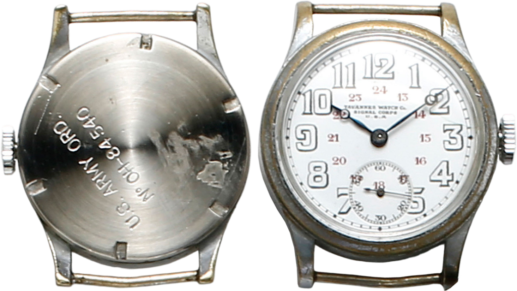 ウオルサム・デポリア防水時計。デポリア社製の防水ケースは性能が高く、多くの時計メーカーが採用。防塵、耐震性にも優れる。裏ぶたにはU.S.Aの文字とシリアルナンバーが刻印される。1917~1919年製。