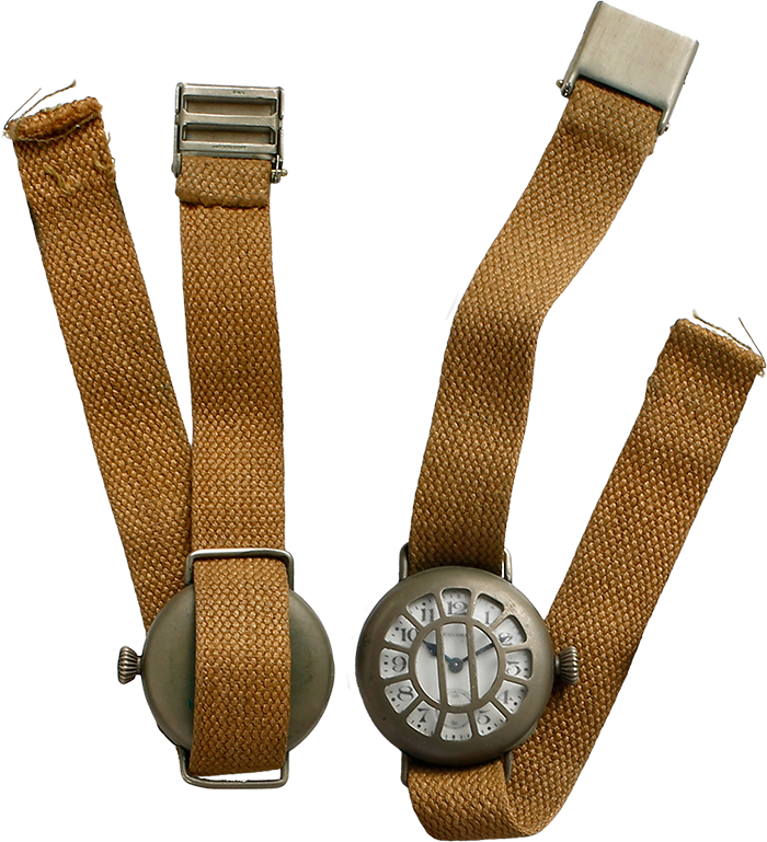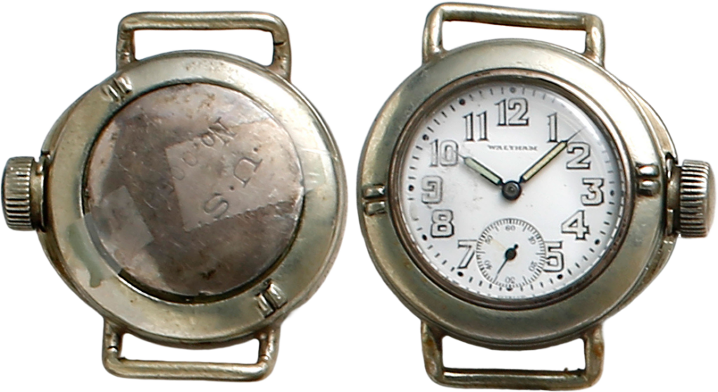 腕時計初期に作られた陸軍兵士用のウオルサム製ソルジャー・ウオッチ。風防を保護するためにグリッドを備える。ラグの取り付け方が懐中時計から腕時計への移行期を物語る。