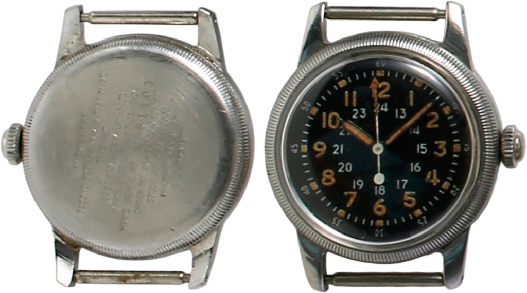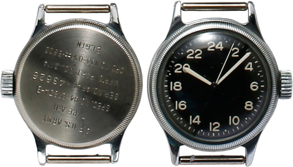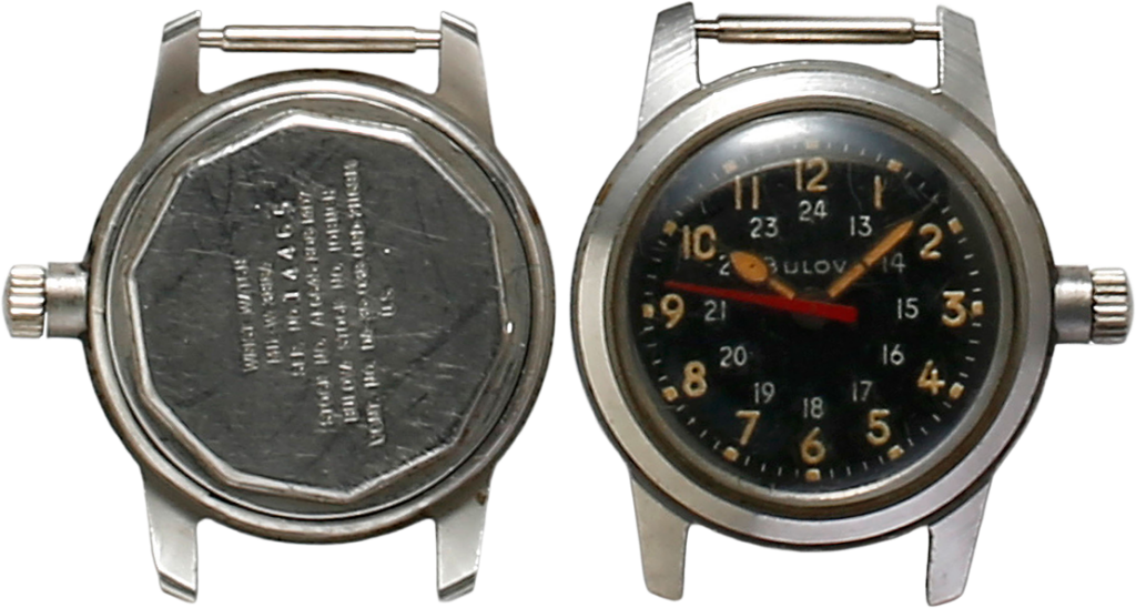 MIL-W-6433Aで生産されたタイプA-17Aナビゲーションウオッチ。ブローバ製ブラックダイアルで12時表示の内側に24時表示もされている。特に防水性能がアップしてピッチ数の多いねじ込み式の裏ぶたが使用されている。スペックがぎっしり刻印されている。