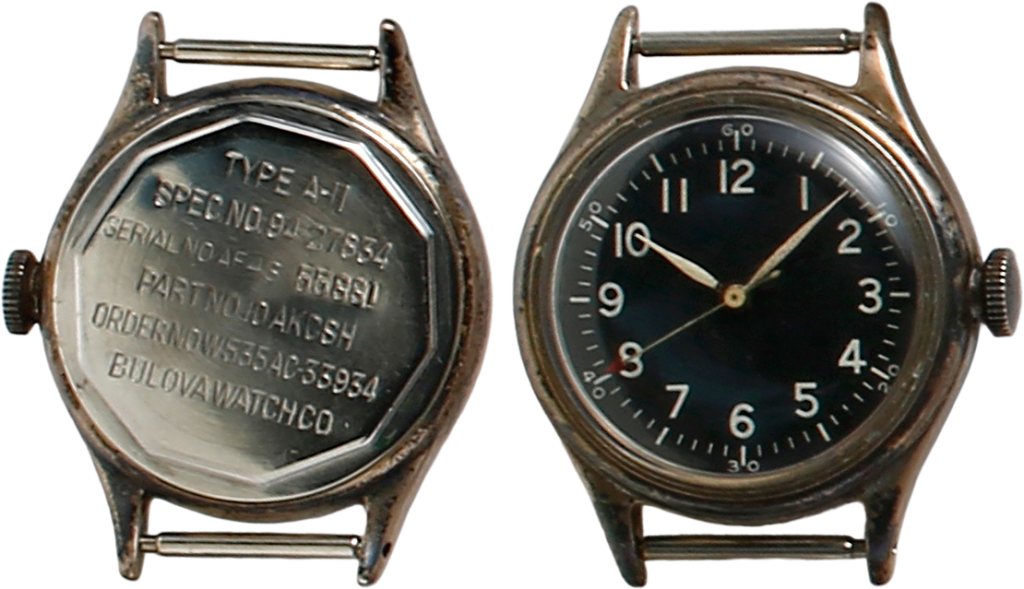 ブローバ製ナビゲーション・ウオッチ、タイプA-11。1940年5月1日に標準支給品として採用された。裏ぶたはねじ込み式である。TYPE A-11の文字は1段目あるいは2段目に刻印される。