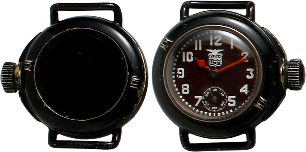 エルジン・デポリア防水時計。防水ケースで有名なデポリア社のケースにエルジン製ムーブメントを搭載し、支給された。ケース全体がブラック塗装で文字盤は陶製。刻印はない。