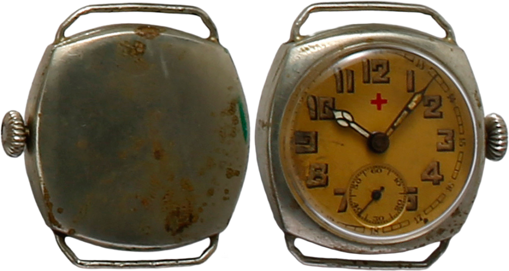 ポケットウオッチの小型ムーブメントを使用したリストウオッチ。兵隊や看護婦に支給された。裏ぶたには一切の刻印無し。