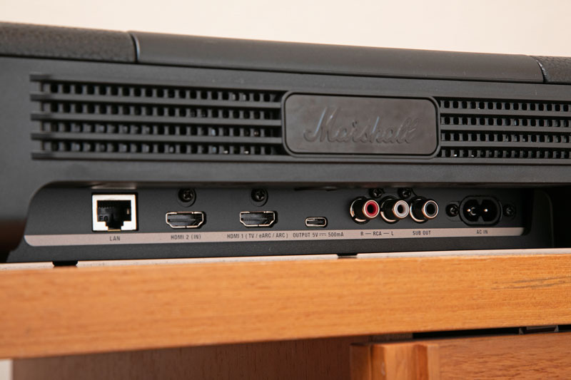 有線入力はHDMI eARC、HDMI入力(パススルー)、RCAステレオ、RCAモノ(サブ出力)、USB-C、イーサネット、マイクを装備。