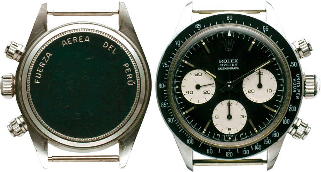 ペルー空軍。プッシュボタンにねじ込み式を採用した1970年代後期のコスモグラフ・デイトナ。ペルー空軍 “Fuerza Aerea Peru” の刻印。