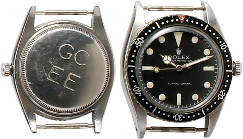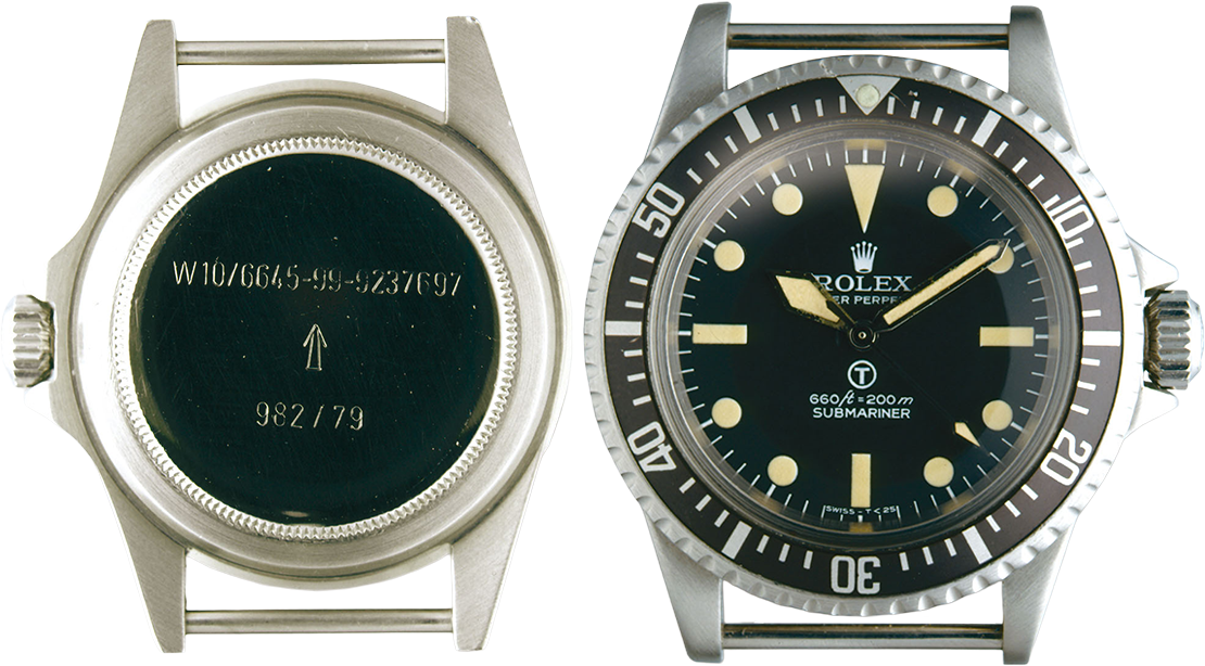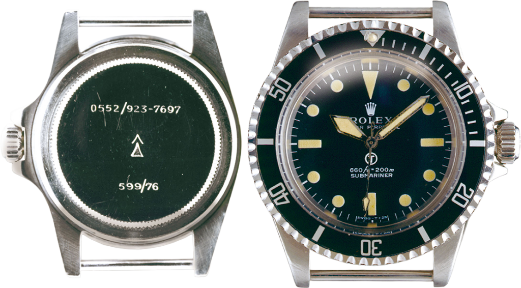 イギリス海軍ダイバーに支給された200m防水のサブマリーナー。イギリスの海軍コード0552と矢じりを刻印している。