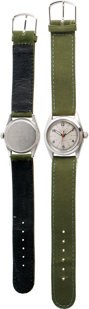 イギリス空軍。1940年代製のロレックス・オイスター・ロイヤライト。直径30㎜の小型。記号ではなく “ROYAL AIR FORCE UK” と刻印されている点が珍しい。1942年に調達。