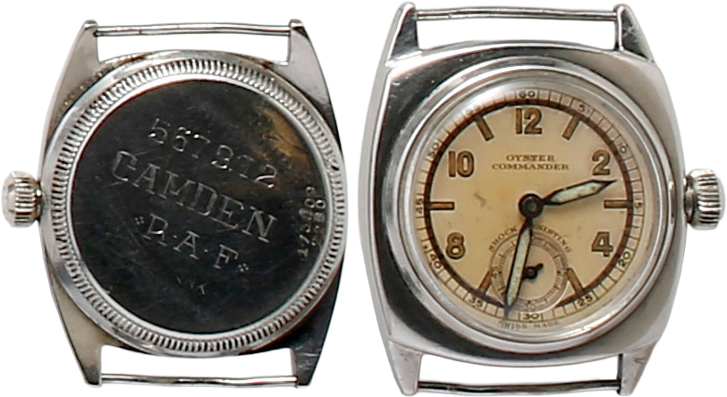 1940年代。イギリス空軍兵士が使った初期のオイスター・コマンダー。直径28㎜の小ぶりなケースで、手巻きムーブメントを搭載する。R.A.Fはイギリス空軍を示す。
