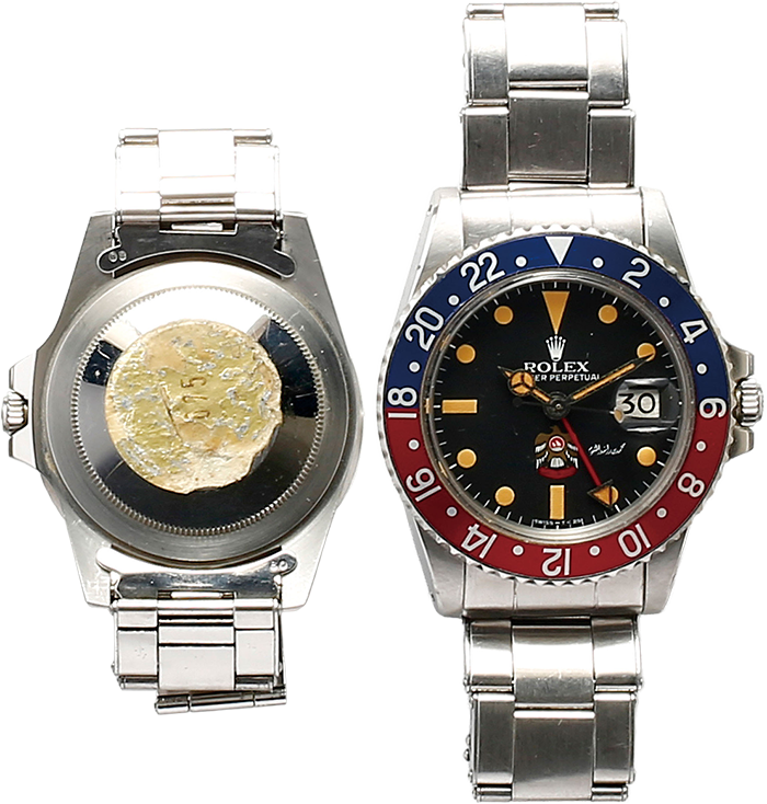 1970年代。GMTマスターの第2世代にあたるRef.1675。アラブ首長国連邦の紋章が入る。バックには一切の刻印が入っていない。