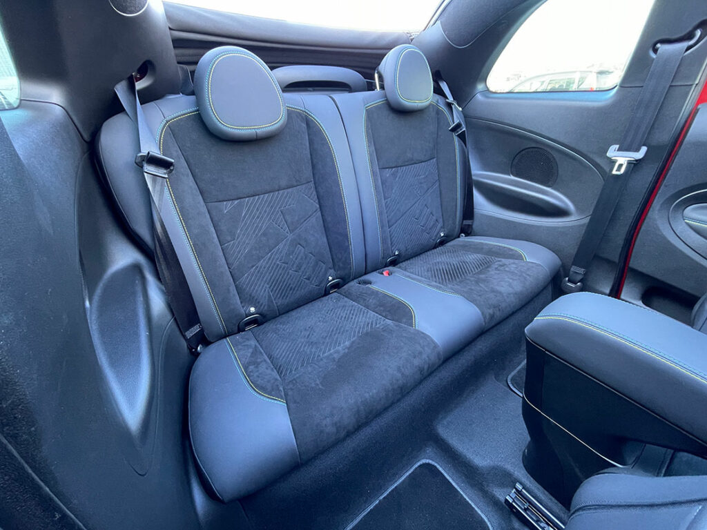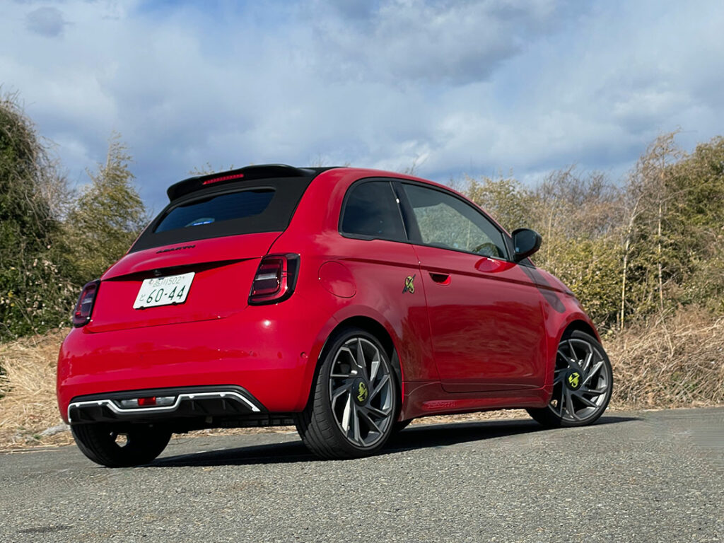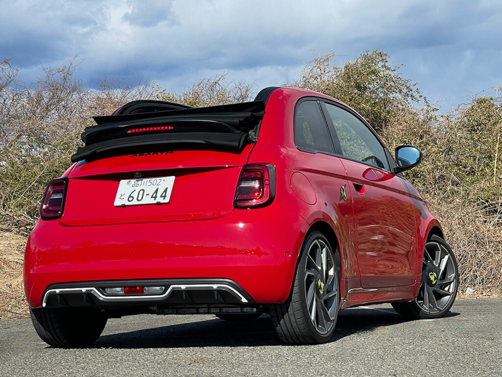 試乗車アバルト500eTurismoカブリオレ(以下、ツーリスモ)はEVでは数少ないカブリオレモデル。リアウィンドウを残して開くキャンバストップとフルオープンは任意で選択できる。ただしフルオープンにするとルームミラーの半分は格納されたルーフになるので、自分でミラーを調整するなりの対策を求められる。しかしながら「そこがイタ車っすよォ」と根がアナログな筆者はこの不便さに萌える特異体質でもある。なおフルオープン時でもCピラーが残るので後席にいても風の巻き込みは耐えられるし、会話の声がデカくなる。コレが楽しいのだ。