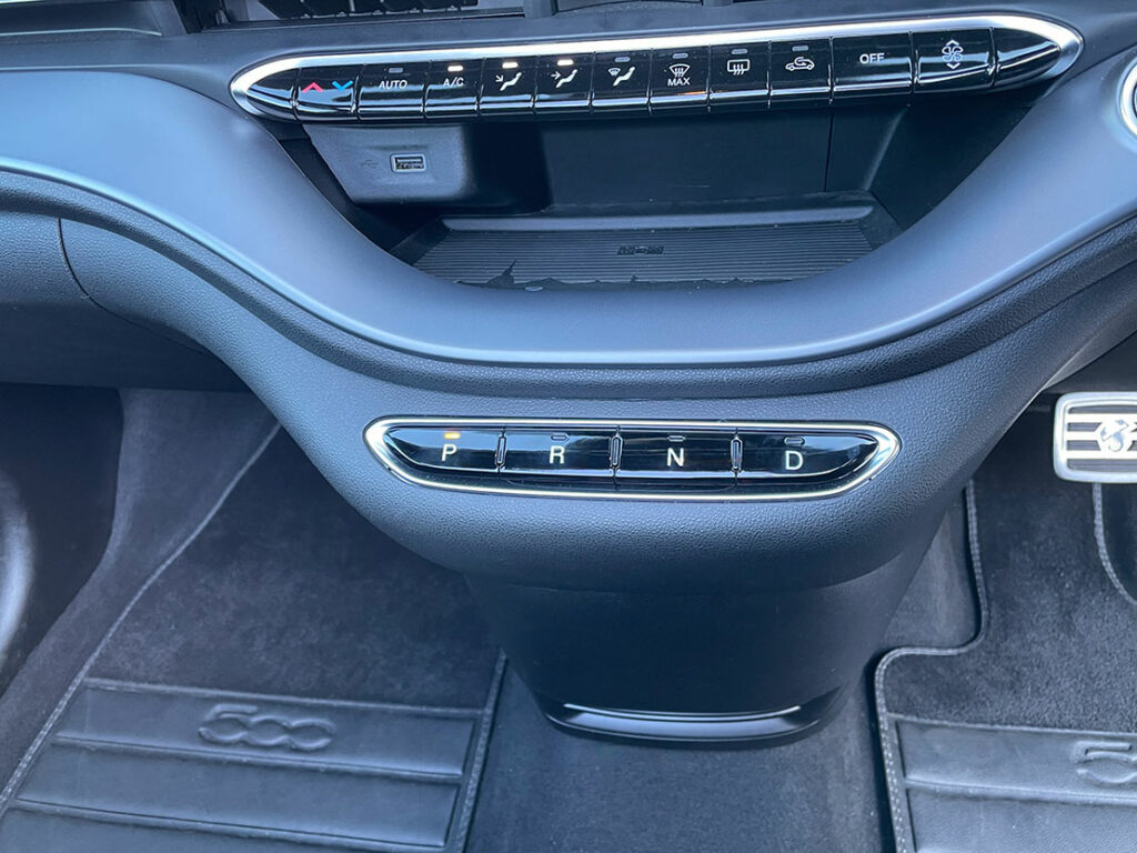 さてアバルトであるからしてベース車両は当然フィアットになる。インパネデザインは基本的にベースとなった500eに準じるモノ。シフトセレクターはボタン式だし、その上にあるフィアットゆかりのトリノの街並みがデザインされた棚状のQi規格の充電器も500e同様。ただしレザーとアルカンターラを豊富に使ったシートやステアリングなどは専用品でブランドらしいスポーティさが演出される。