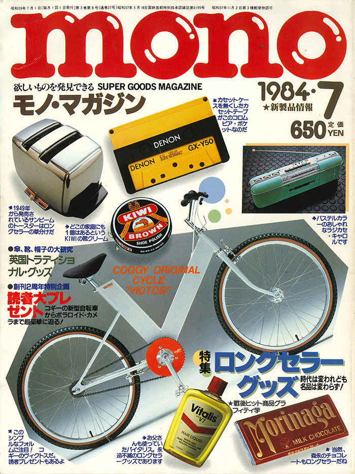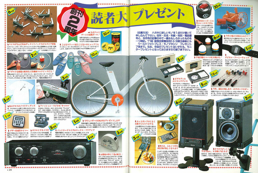 ハイ、これが25号の表紙です。真ん中にドーンと載っているのはコギーの自転車「ヴィクトス」です。今号の創刊2周年特別企画「読者大プレゼント」のひとつ。豪華です。右上のシャープのラジカセ「キャロル QT-50」もプレゼントです。ホントに豪華ですね。