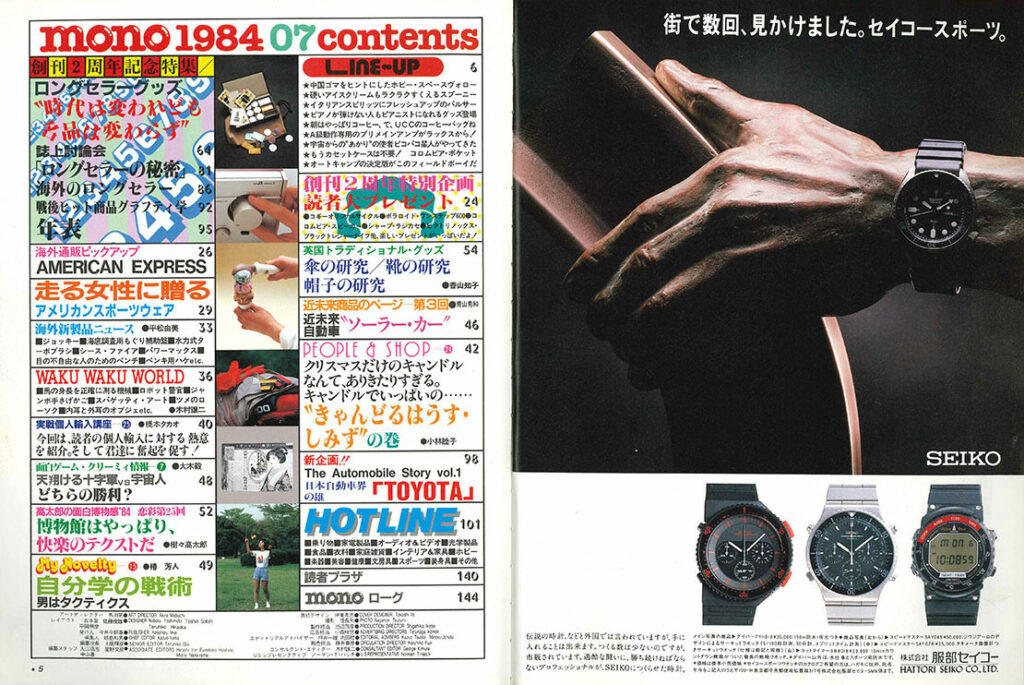 目次です。右ページの広告は、SEIKOのセイコースポーツ。ブロンズの腕を使った力強いビジュアルです(時計の向きが気になりますが••••••)。で、左下のキャプションを引用しときます。