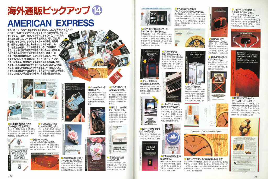 「海外通販ピックアップ」のページ、今回は「AMERICAN EXPRESS」のカードメンバー用ショッピングカタログです。1品ずつ1枚のフォルダーになっていて、それがそのまま注文書になるようです。それぞれのフォルダーのデザインがクールでいいですね。