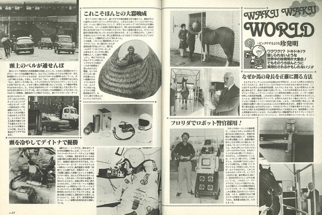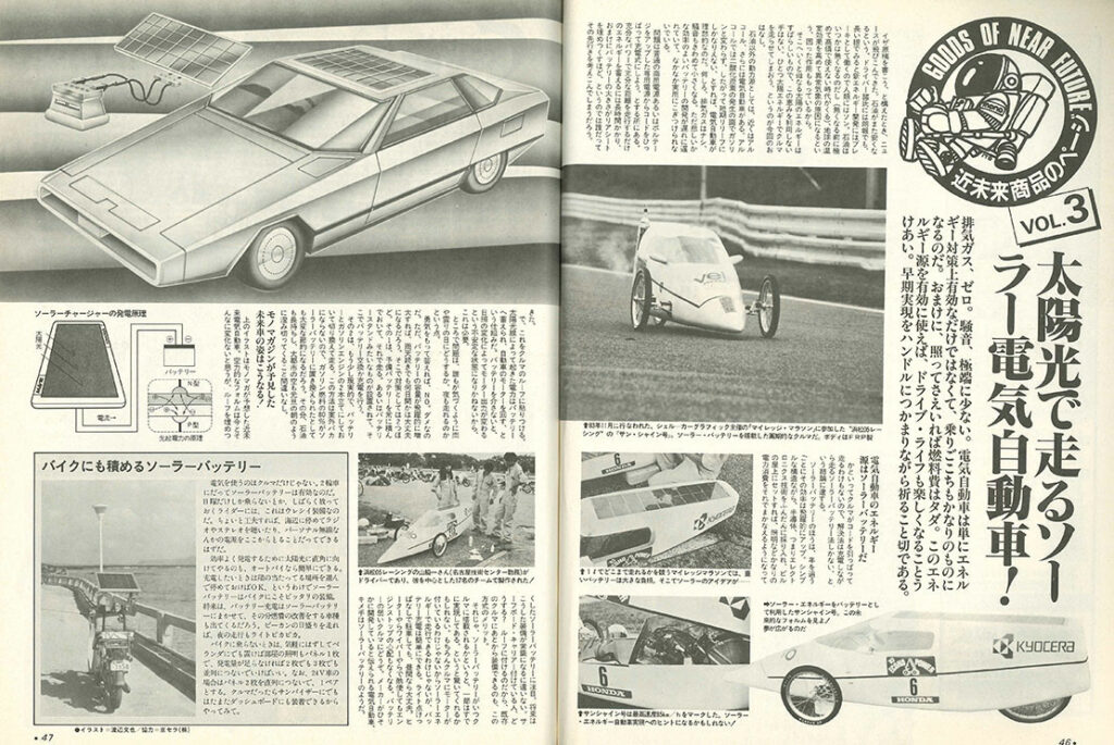 モノクロ2ページの「GOOS OF NEAR FUTURE 近未来商品のページ」は、「太陽光で走るソーラー電気自動車!」。太陽光のみで走るクルマというのは、一般車両として未だ実現ならずですが、太陽光で走行距離を補うソーラー充電機能付き電気自動車(ソーラーEV)は、そろそろ実用化が見えてきたようです。