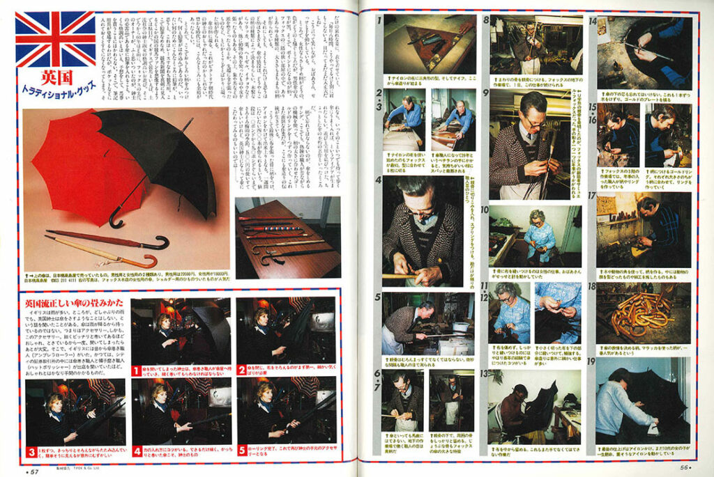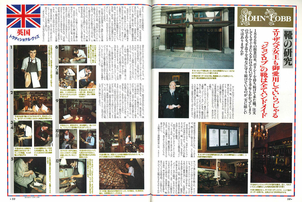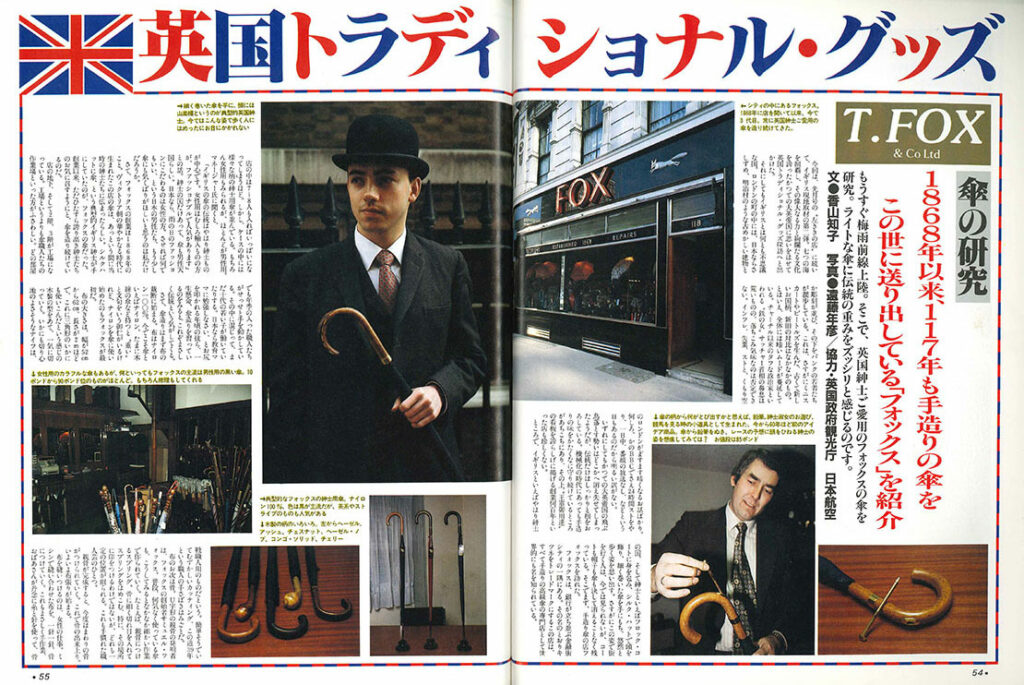 「英国トラディショナル・グッズ」は、カラー8ページ構成。最初の4ページでT.FOXの「傘の研究」、続いて2ページでJOHN LOBBの「靴の研究」、最後の2ページでLOCKの「帽子の研究」を紹介してます。
