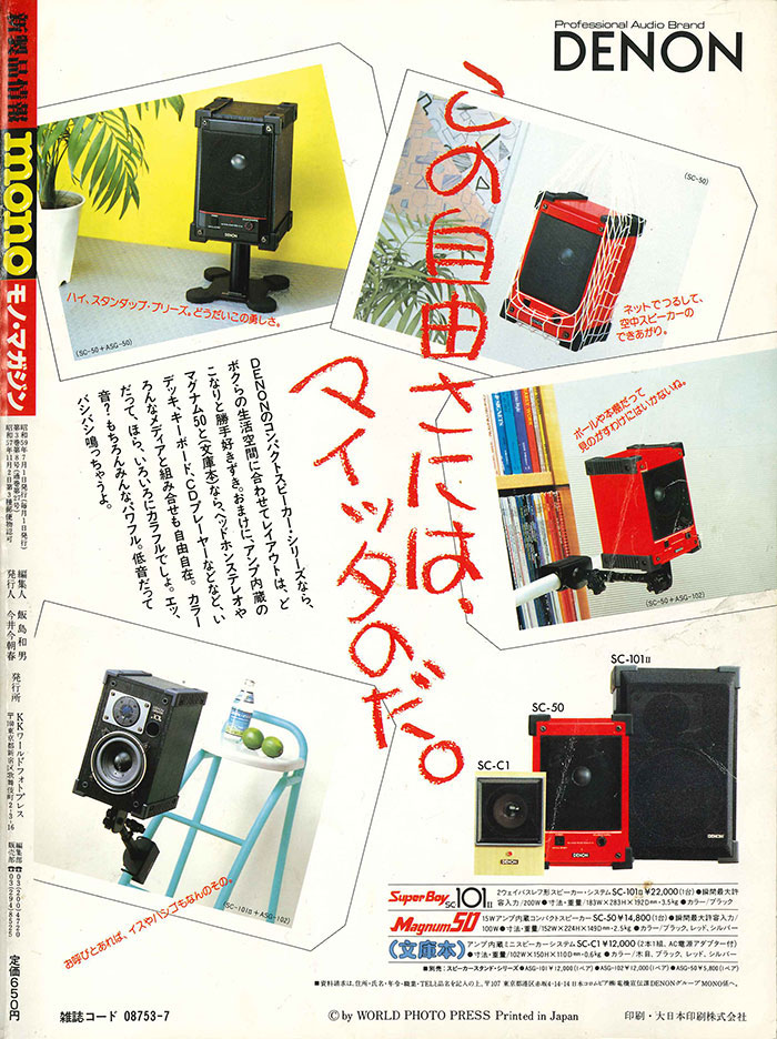 表4の広告はDENONのコンパクトスピーカー・シリーズです。キャッチコピーは「この自由さには、マイッタのだ。」。この文字、たぶんダーマトグラフ(通称、ダーマト)で書かれてます。ダーマトというのは紙巻きの軟質色鉛筆で、ガラス、金属、プラスチックなどに書くことができたんで、昔の出版社では入稿するとき、切り出したポジフィルムを入れた小さく透明なポジ袋に、このダーマトでレイアウト用紙に書かれたのと同様の番号(合番)を書くのが通例でした。なんで、昔の編集者にとっては必需品だったんですが、写真がデジタルデータになった今となっては、手元に置く編集者はあまりいないと思います。