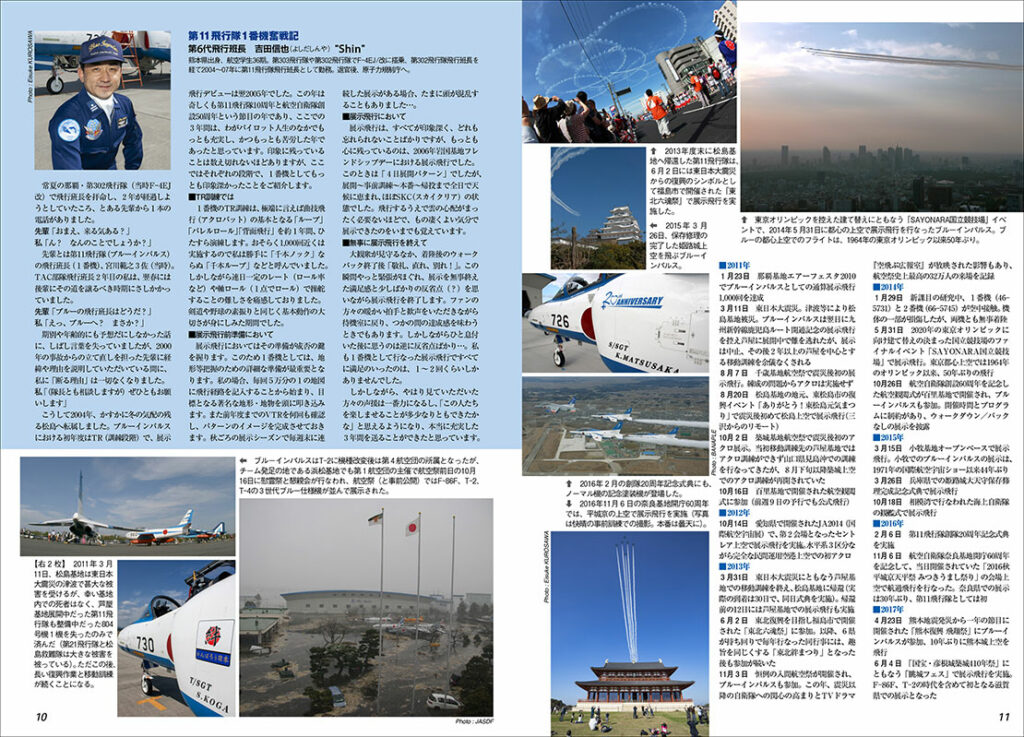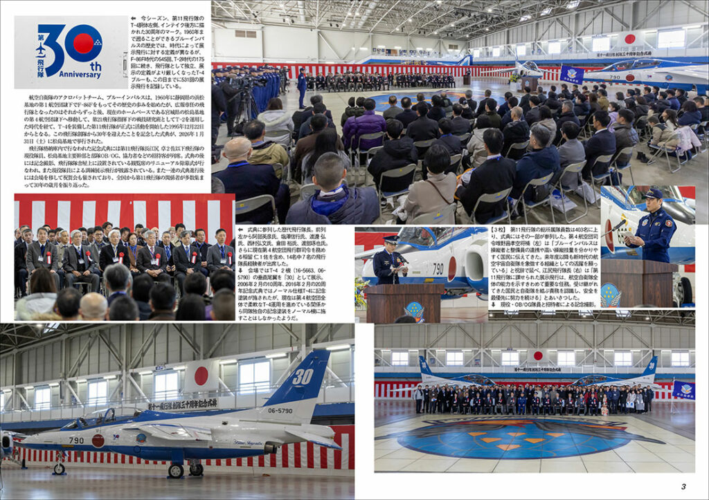 また、今月は自衛隊航空にも関連して、昨年12月22日に創隊30周年を迎えた第11飛行隊ことT-4ブルーインパルスについても大きく採り上げます。1960年にF-86Fをもって誕生したブルーインパルスですが、航空自衛隊初の正式な広報部隊となったのは、30年前、T-2からT-4への機種改変の機会となった1995年でした。巻頭では多くのOBが集まり1月末に松島基地で開催された記念式典の模様とT-4ブルーの足跡をまとめます。