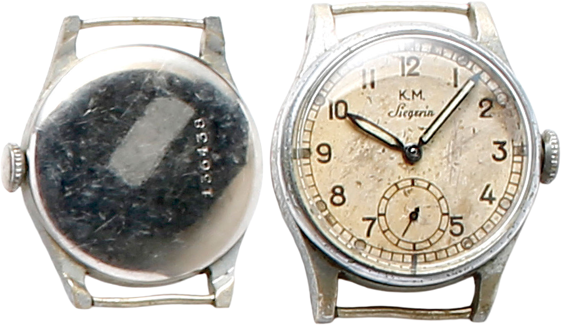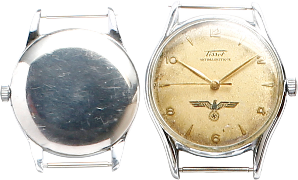 スイスのティソ製。ナチス・ドイツ時代のドイツ国防軍のマークが記される。裏ぶたに刻印なし。
