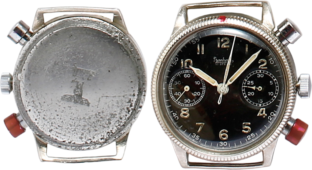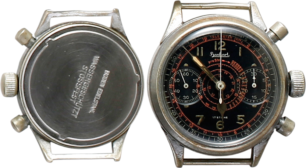 1940年代のハンハルト製の空軍用クロノグラフ。赤のボタンはクロノのリセット用。ステンレススチールの裏ぶたに国防軍の紋章を刻んでいる。