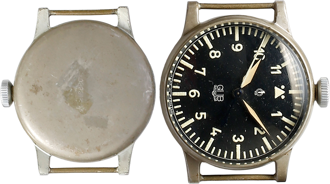 ドイツのグラスヒュッテにあった時計メーカーGUBのナビゲーションウオッチ。大型のこの時計は長い革ベルトで大腿部につけて使用された。ムーブメントは金メッキ。裏ぶたには製造ナンバー、組立ナンバー等が刻印されている。
