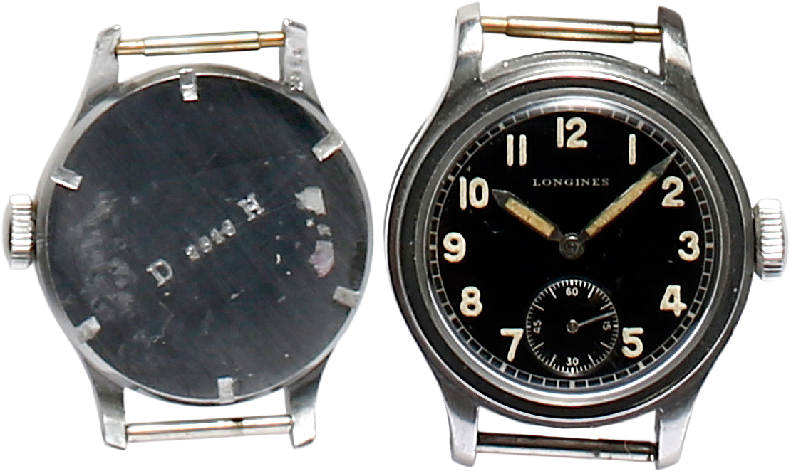 ロンジンがヒトラー政権下のドイツ陸軍に納入した一般用。ドイツ陸軍を示すDとHの間にシリアルナンバーが刻印されている。