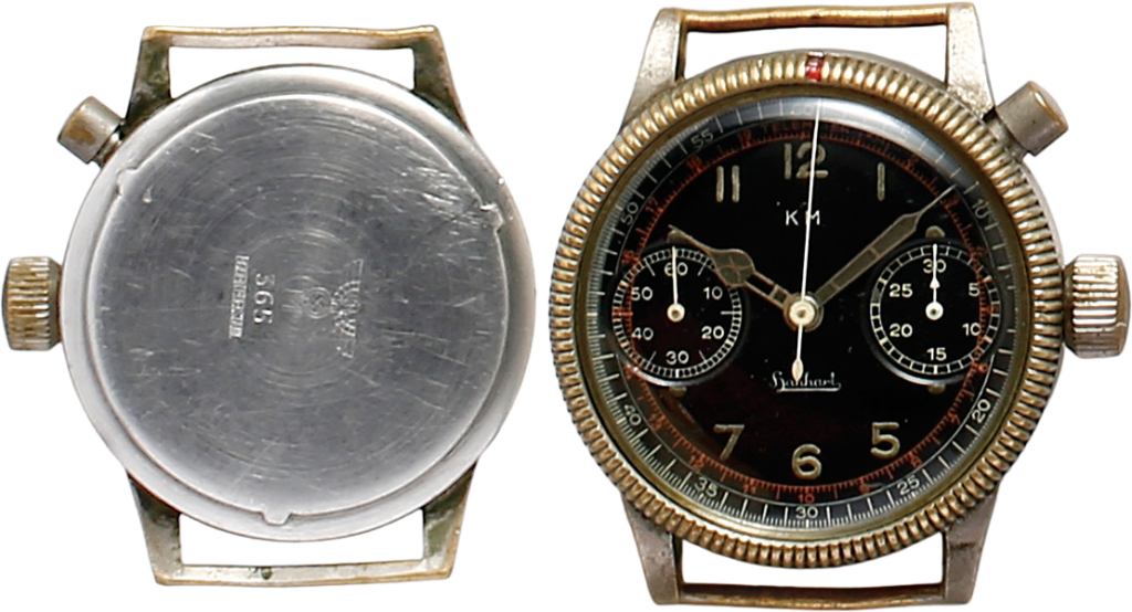 ドイツ海軍用のクロノグラフ。テレメーター目盛りを文字盤に配したハンハルト製。ハンハルトは精度の高いクロノグラフの開発で海軍から信頼を得ていた。防水性能も高い。