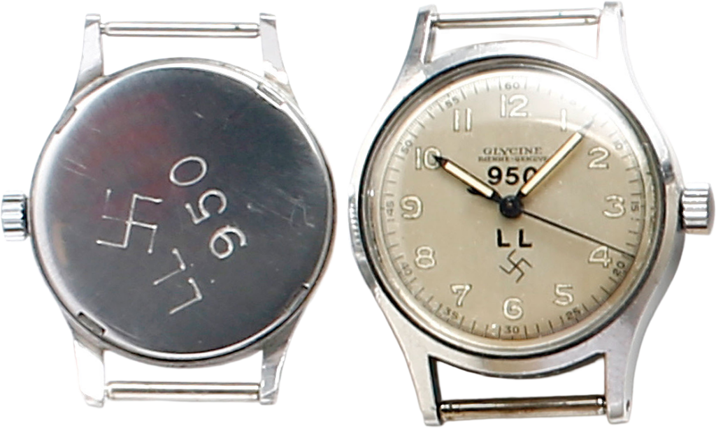 ハーケンクロイツを記したグリシン製。詳細は不明。珍しい文字盤。文字盤と裏ぶたに記された950は独軍調達局から時計に与えられる納入ナンバー。