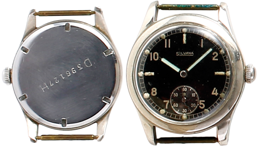 1942年ごろのシルバーナ社製陸軍時計。DとHの間にシリアル番号をはさむ。旧ドイツ陸軍時計に典型的な刻印。