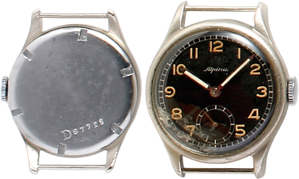 アルピナ592のドイツ陸軍の腕時計。刻印のDはDeutsche(制式時計の意)の略。そのあとにシリアルナンバーがつく。