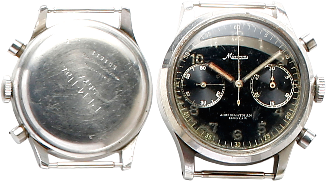 精度の高い時計をつくることで有名なミネルバのパイロット用クロノグラフ。帝国航空省に納入された。裏ぶたには防水性能の刻印とRLM(帝国航空省)の略印が刻印されている。