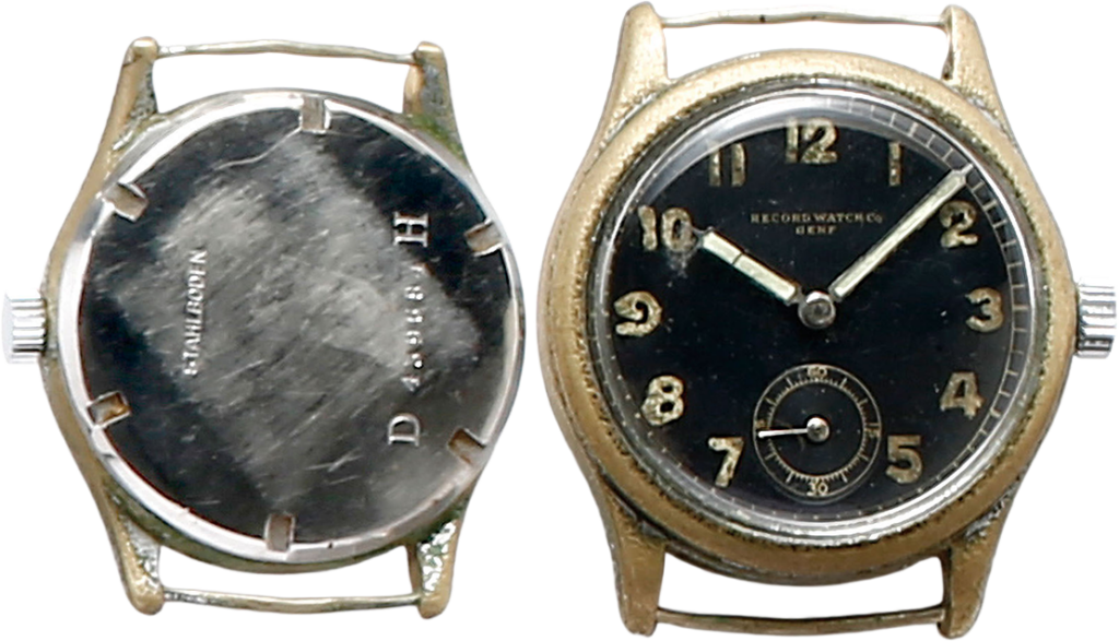 レコード軍用時計。他の通常の軍用時計よりやや大ぶりなケースが使用されている。裏ぶたのD(Dienstahe)H(Heeh)の間にシリアルナンバーが入る。標準的なドイツのミリタリーウオッチのコードである。