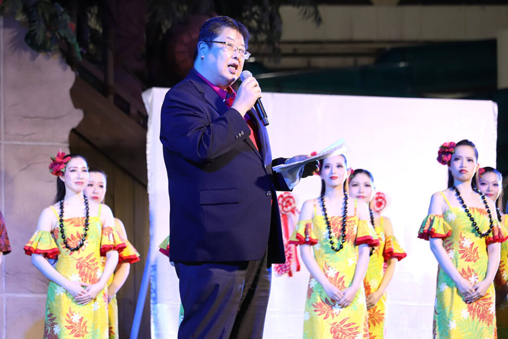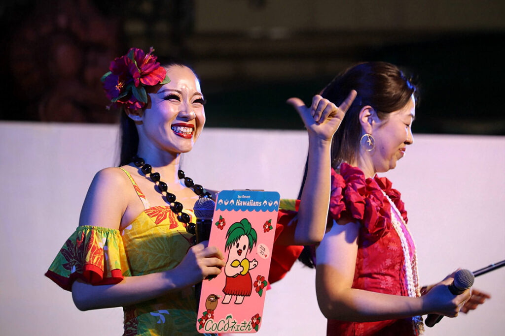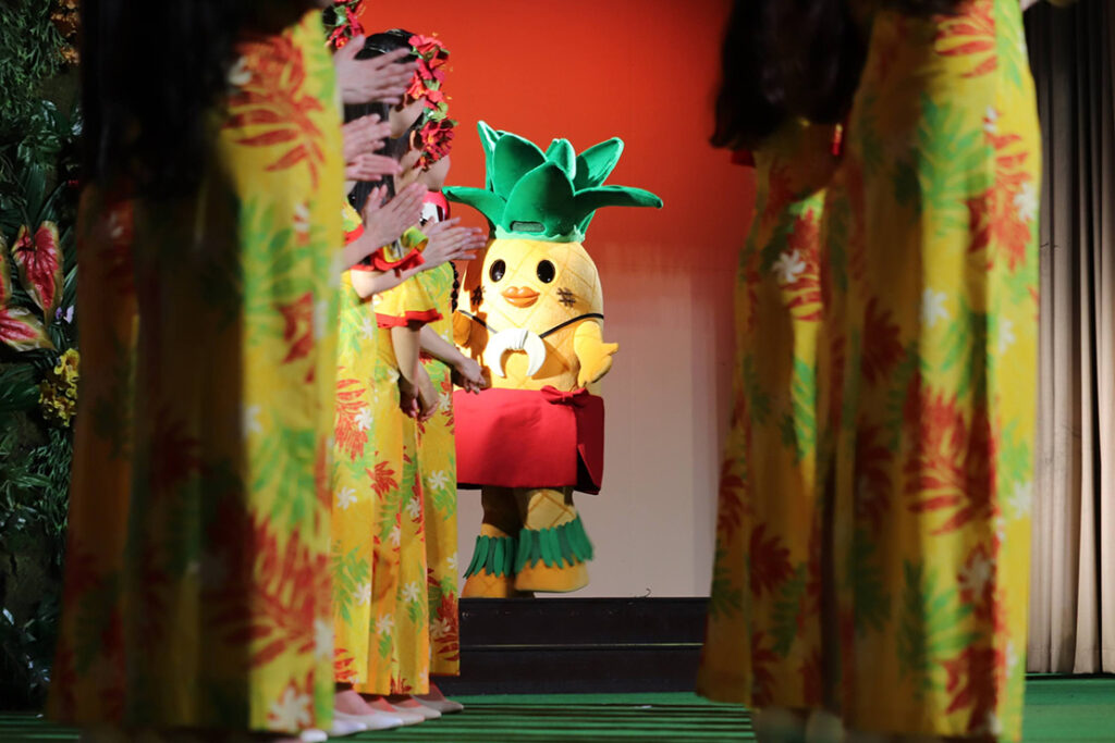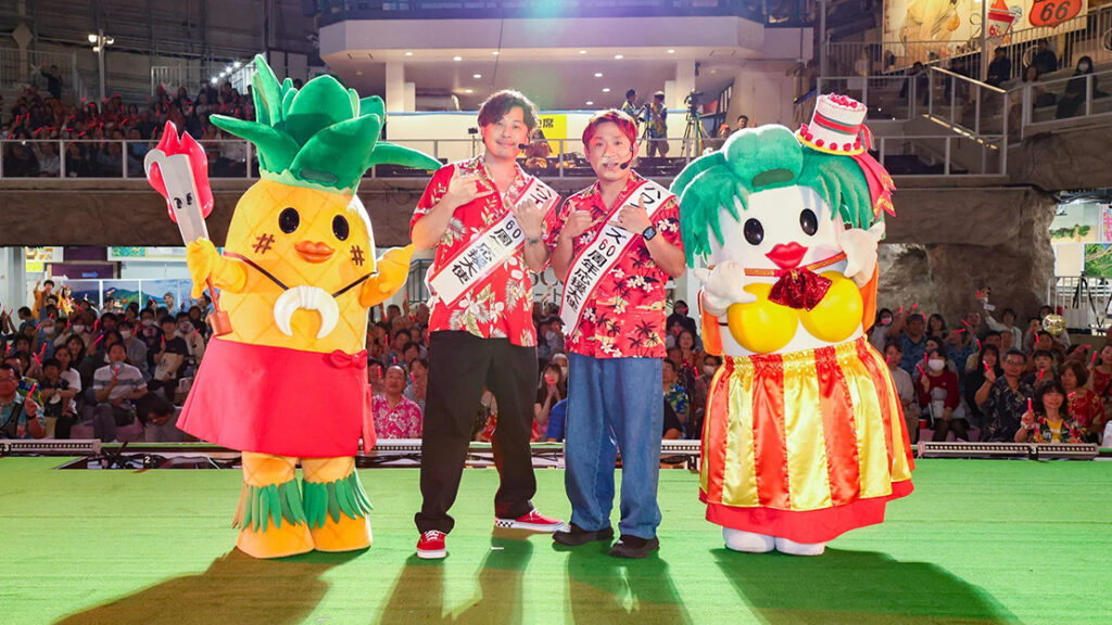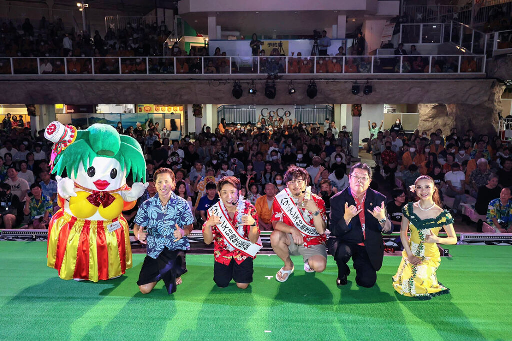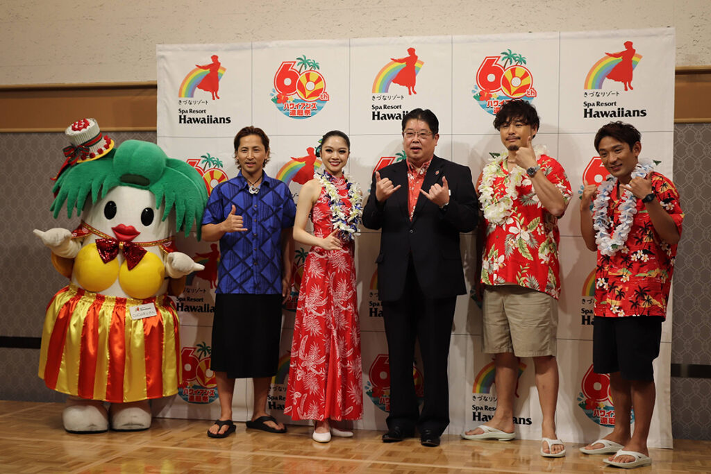「ハワイアンズ還暦祭」のフィナーレは、常磐興産 取締役社長執行役員・関根一志さんによる、お客様への感謝と今後の抱負を込めた挨拶からスタートした。続いて、応援大使のアルコ&ピースが登壇し、会場のムードは一気に華やかに。さらに、60周年にふさわしい新キャラクター「パナシバ」君のお披露目式も実施。節目の年を祝うにふさわしい、盛大なフィナーレとなった。