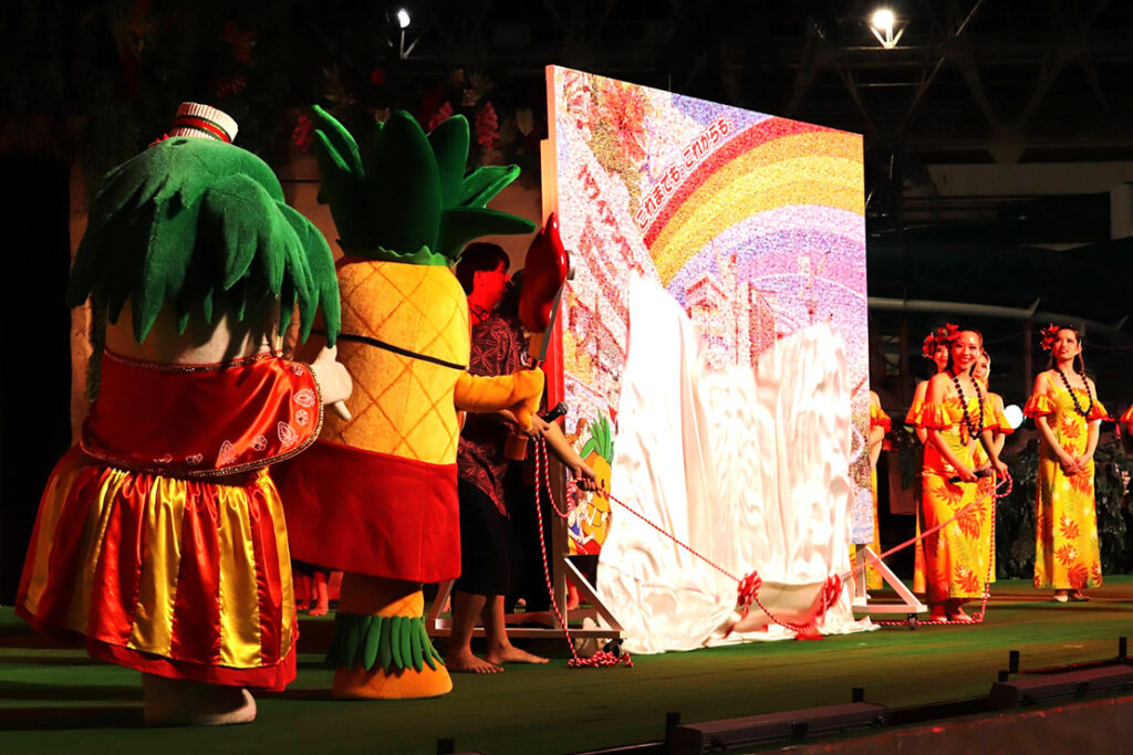 「ハワイアンズ還暦祭」の集大成として、2025年2月から8月末まで、一般と社内の両方から “思い出の写真” を募集。集まった写真は2,689枚、使用されたモザイクタイルは約14,000枚にのぼる。完成したアートは、イラストレーター・ユアサミズキさんのデザインをもとに制作されたもの。20mm角のタイル一つひとつに、ハワイアンズとお客さまが歩んだ60年の記憶が刻まれている。