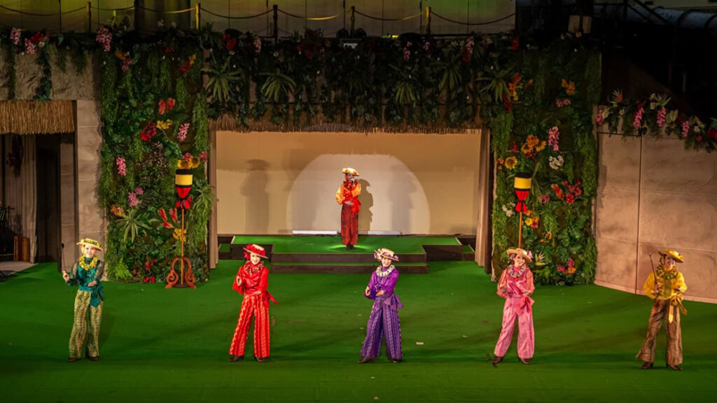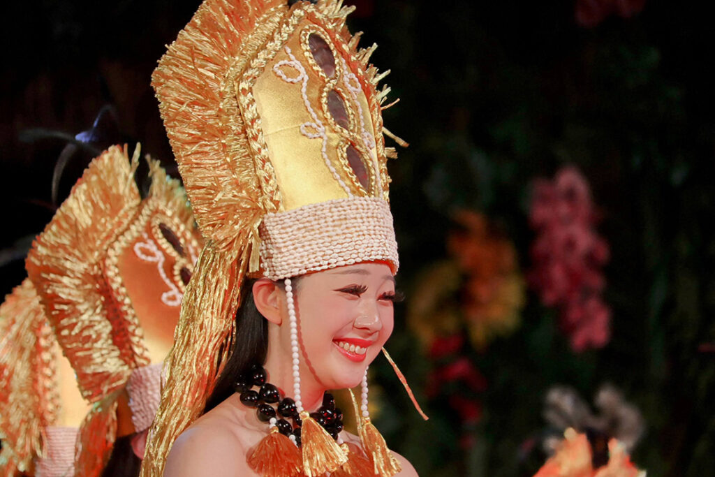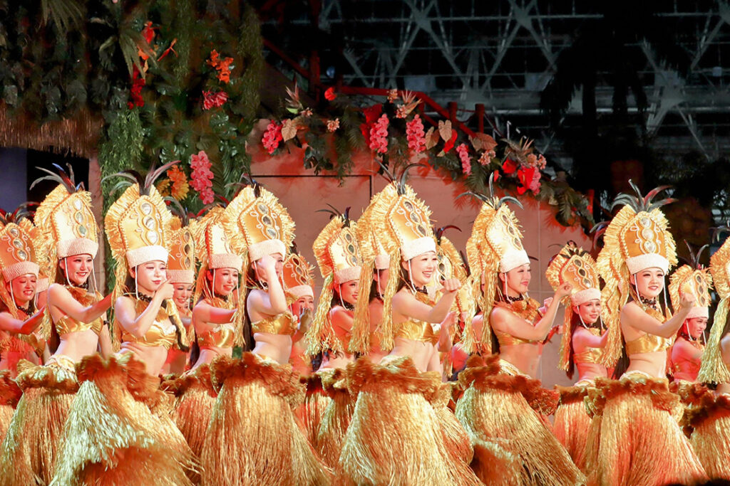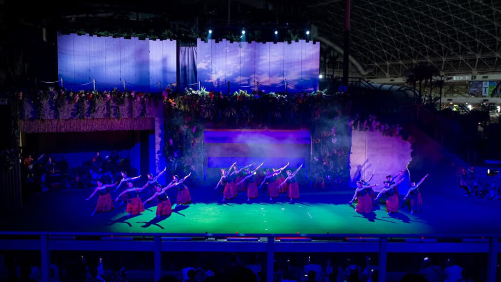 60周年最初のステージが始まる。「Haku Lei~アロハの絆~」。ハワイアンズの新夜ショー「Haku Lei~アロハの絆~」は、単なる南国エンターテインメントではない。その幕開けを飾るオープニング〈カメハメハ〉は、ハワイ王国の象徴を冠しながら、観客を “物語の中心” へ一気に引き込むための儀式のように構成されていた。