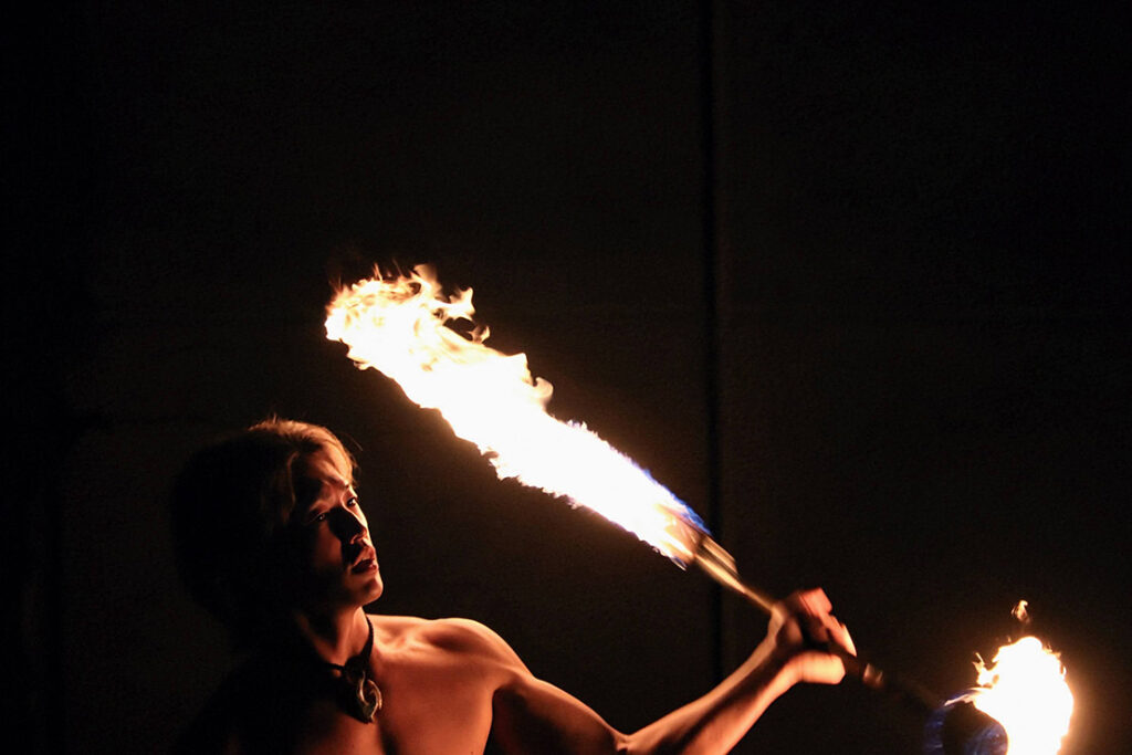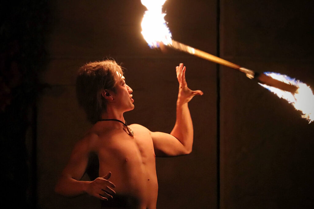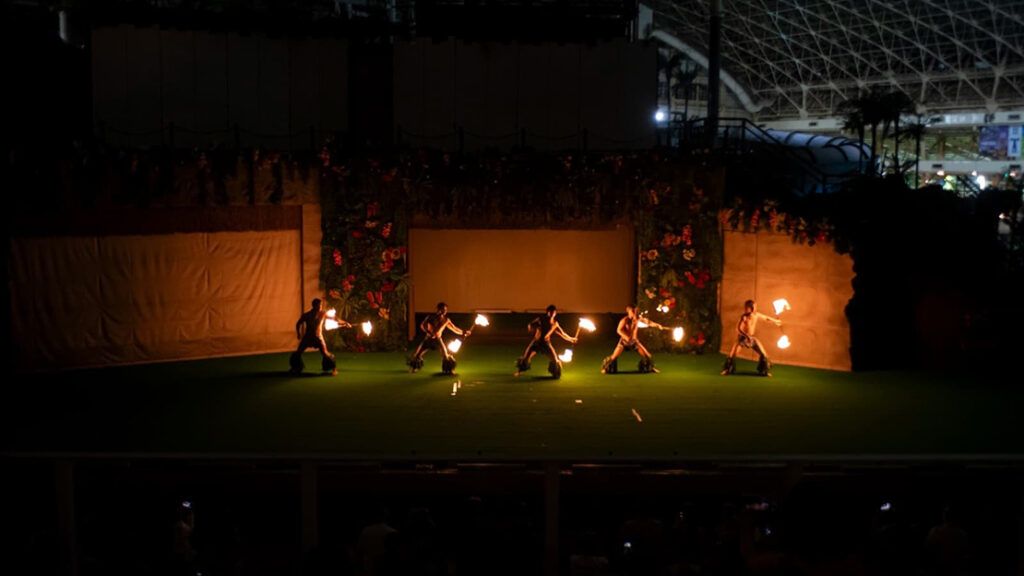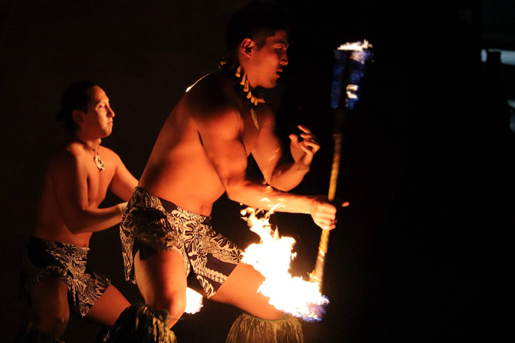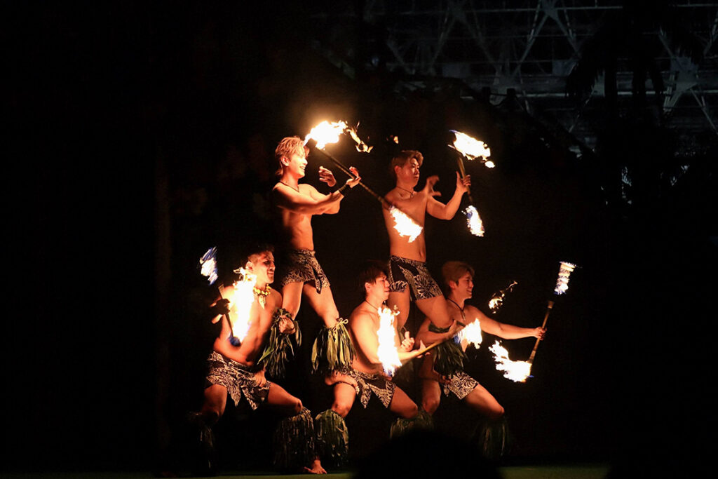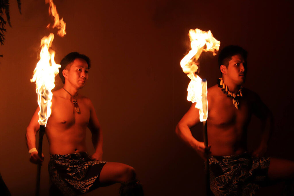 サモアに伝わる伝統芸能「ファイヤーナイフダンス」をベースに、ハワイアンズならではの演出と身体能力が融合する。手にした炎の棒を高速で回転させ、投げ、受け、時に背中や足の下を通しながら、火の軌跡で空間に模様を描く。その動きは荒々しいのに、どこかしなやかで美しい。その炎の温度は500度だ!