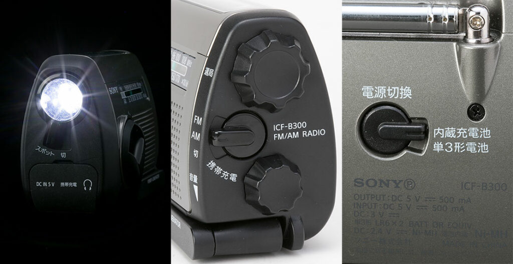 AM/FMラジオの受信に、スマートフォンやケータイの充電、夜間や停電時に便利なLEDスポットライト装備と、普段使いはもちろん非常時に便利な機能を備えたポータブルラジオ。本体内蔵充電池への充電は手回し、USB AC、太陽光による3つの方法が可能だ。