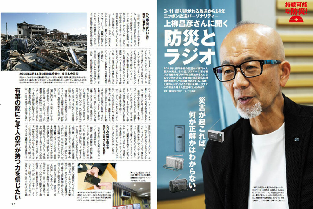 上柳「海に近いエリアはカーナビ上では町があるのに、現実のその場所には何も残ってないのです。その環境下で奇跡的に一件だけ家が残っていて話を聞くことができました。そのお宅は家に留まることで最悪の事態を避けられたようですが、クルマで逃げて大渋滞に遭い津波にのみこまれた人もいましたし、何が正解なのか本当にわからない。そういうこともあり、僕は災害関連の放送中に『外へ出たほうがいい』とは言わないんです。もう一度自分が寝ているところをチェックして、耐震基準を満たした家かどうか、そこが川に近いか、津波がすぐ来る場所かどうか。自分がどう判断したら良いかを、考えるきっかけにしてほしいと考えています」