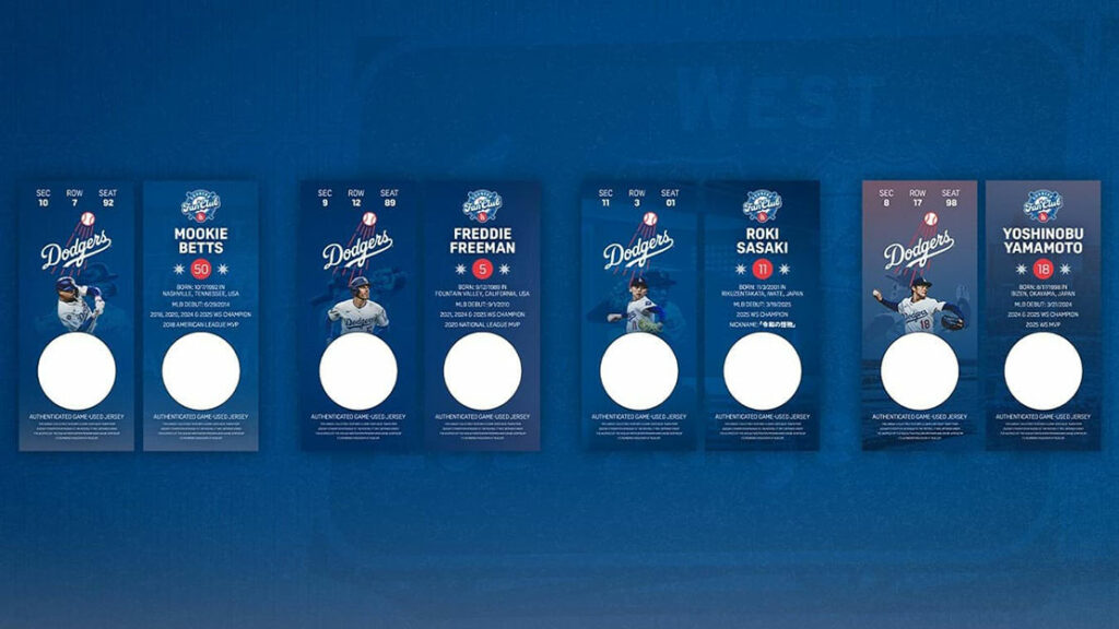 ●実使用ユニフォーム封入「チケット型メモラビリア」。選手の実使用ユニフォームの一部を封入(ランダム)されている。山本由伸、佐々木朗希、フレディ・フリーマン、ムーキー・ベッツ他。