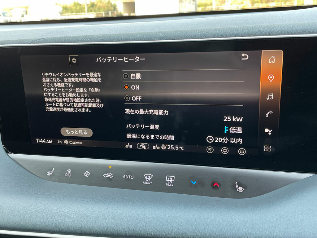 また試乗車にはEVとしてのツボを抑えたバッテリーヒーターのオプションが。これはバッテリーを適温にし、充電パフォーマンスを向上させるというモノ。しかもナビなど道案内中に充電が必要と判断されたら充電ポイントにつくまでに適温にしてくれる。