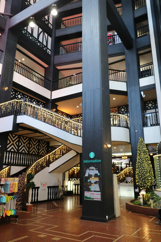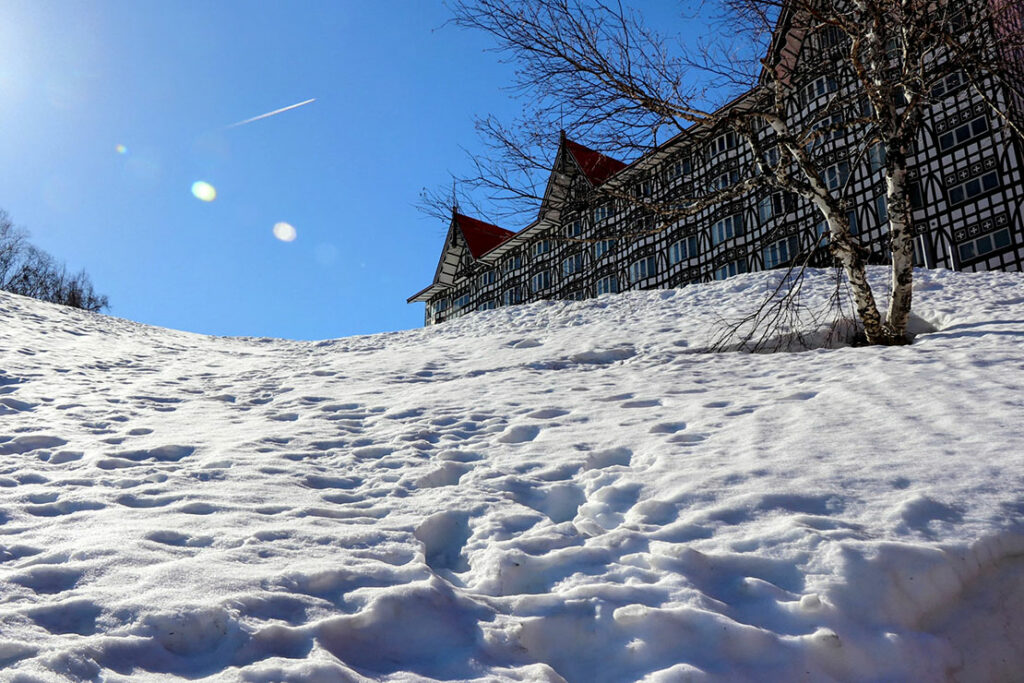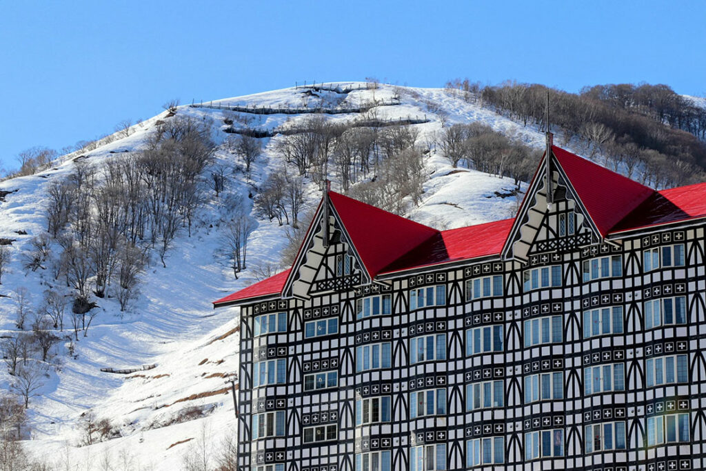 白馬コルチナスキー場の “目の前(徒歩10秒)” に建つ、北欧風デザインが特徴の大型リゾートホテル。赤い屋根と白黒の木骨造りが象徴的で、ゲレンデ直結のオフィシャルホテルとして知られているぞ。