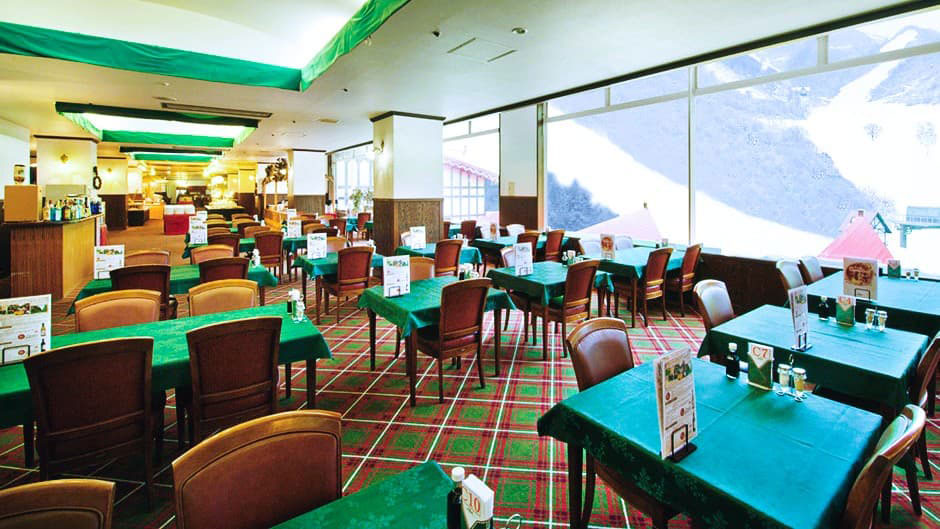 白馬コルチナスキー場のゲレンデが目の前に広がる、圧巻のロケーション。大きなパノラマの窓からは一面の雪景色が望め、眺めを楽しみながら食事を味わえる!