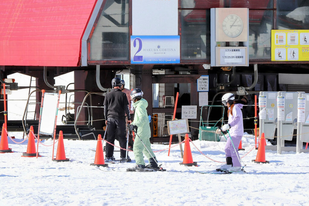 白馬コルチナスキー場のリフトは全6基(ペア4基・クワッド1基・ナイター用1基)。この日は平日のため比較的空いており、待ち時間が少なく何度でも滑走を楽しむことができた。