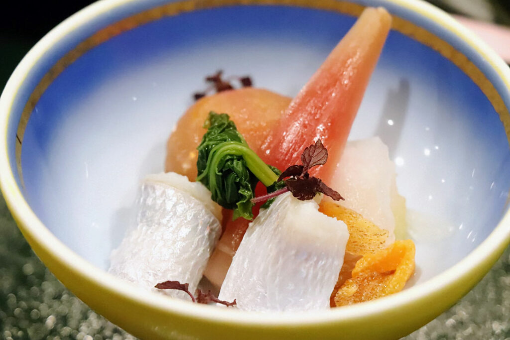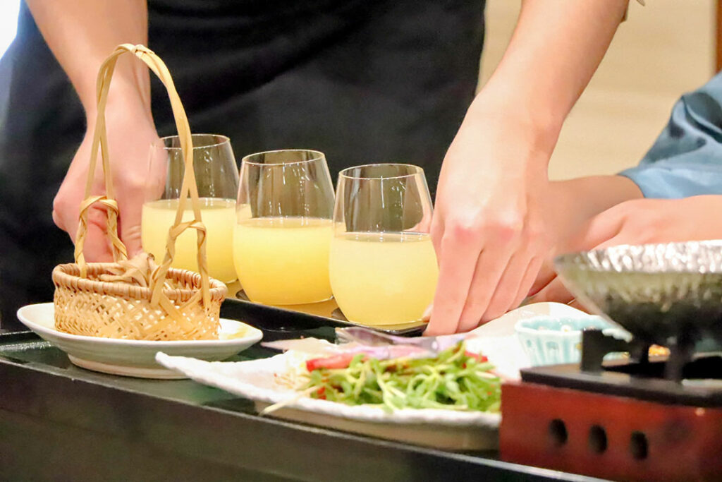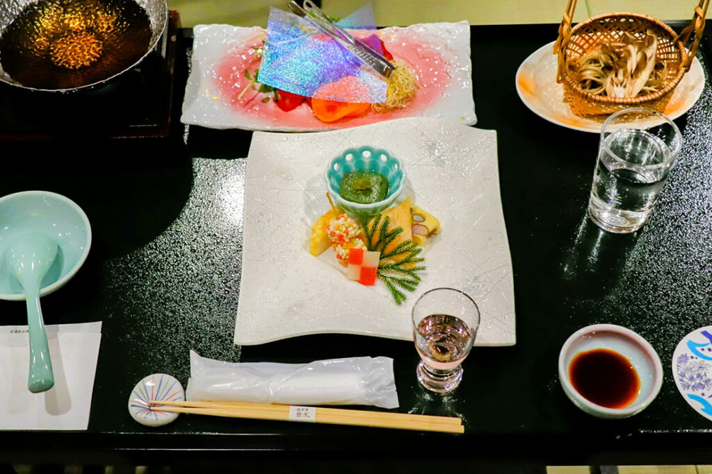 季節の地元食材を中心にした会席料理で、特に “信州らしさ” を感じる前菜構成と、紫蘇 × 林檎の食前酢が印象的だ。料理長・梅井泰雄さんが手がける一品一品を堪能したぞ。