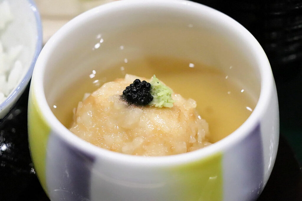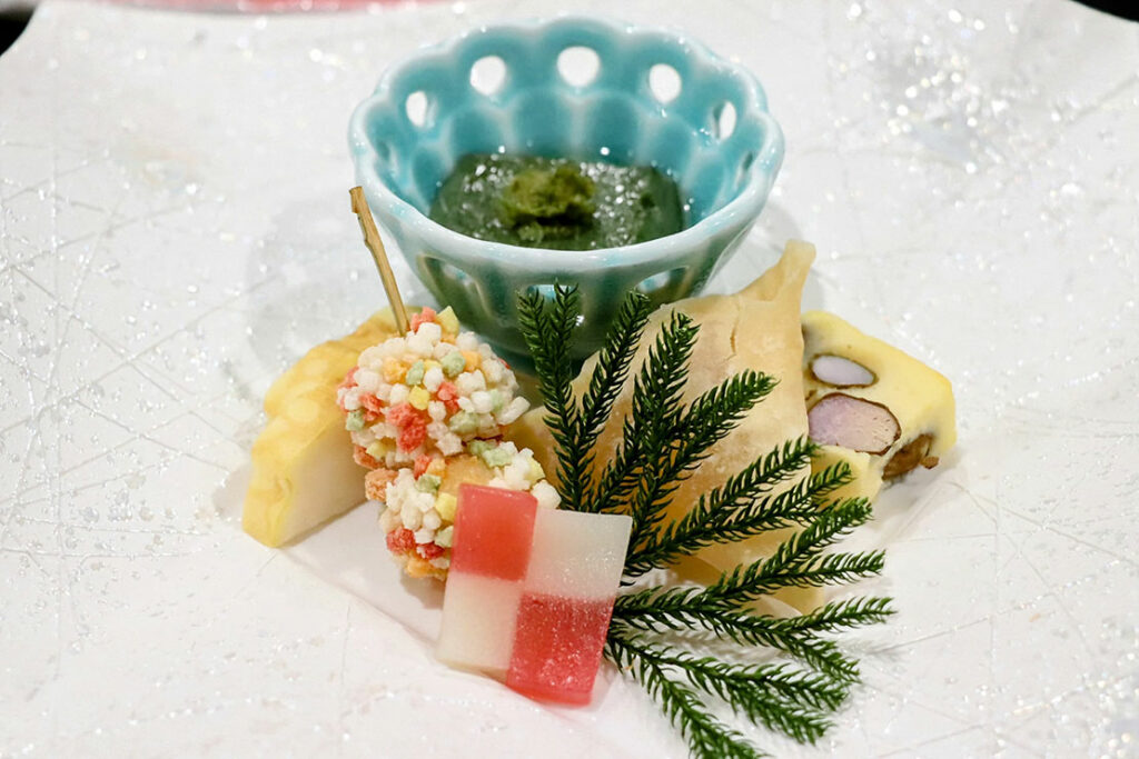 蓬豆腐 市松羊羹 鰈クレープ巻き 林檎春巻き むかご真丈 蟹彩り串
