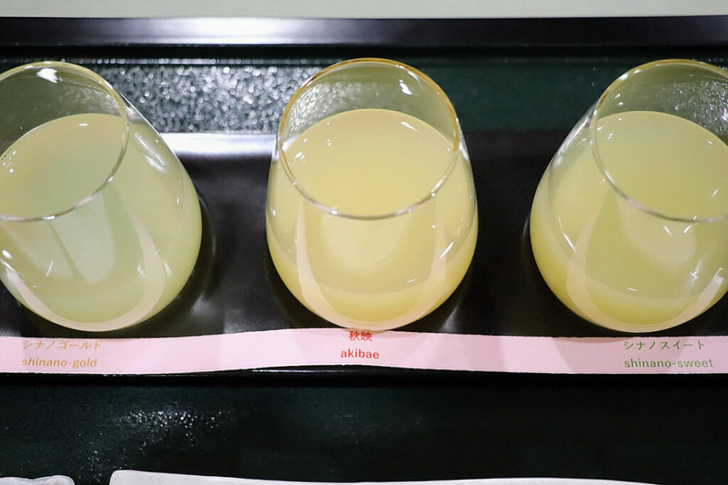 同じ「信州リンゴジュース」でも、品種ごとに香り・甘味・酸味・余韻がまったく違う、利きリンゴジュースは本当に面白い体験だ。順番は「シナノゴールド → 秋映 → シナノスイート」 軽い→重い→甘い の順で、味の違いが最も分かりやすかった。