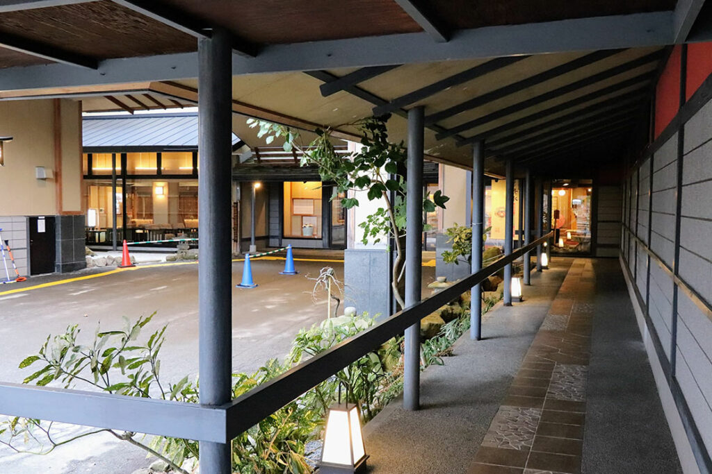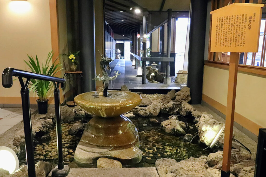 白馬村中心部から車で約30分。今夜の宿は、信州の魅力を堪能できる大町温泉郷の老舗旅館「緑翠亭 景水」。館内では北アルプスの超軟水(硬度10)の湧水を使用し、葛温泉(くずおんせん)※から引湯した温泉を楽しめる。庭園大浴場や、地元食材をふんだんに使った料理も魅力だ。